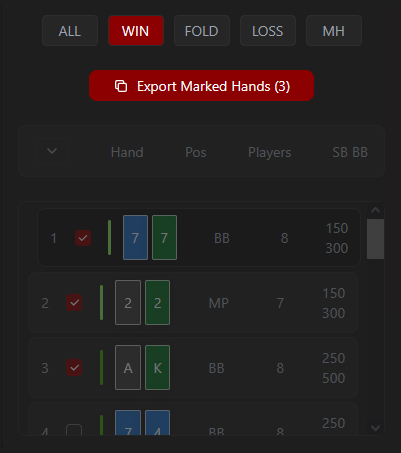 While scrolling the hand list you may select individual hands that will be kept under filter “MH” for “my hands”. You can also export them on a .txt file that reads just like any hand history, from any other cardroom.