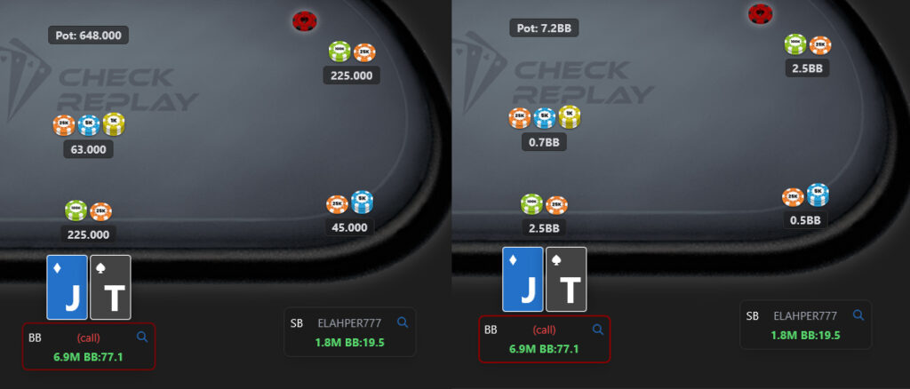 The option of converting stacks and pots to BB is preferred to most replayers. It allows for you to think your game while regarding different tourney phases, being extra aware of different sizes that players put in. When reviewing hands throughout a long tourney, thinking about hundreds of thousands (even millions) in chips can be an eye sore.