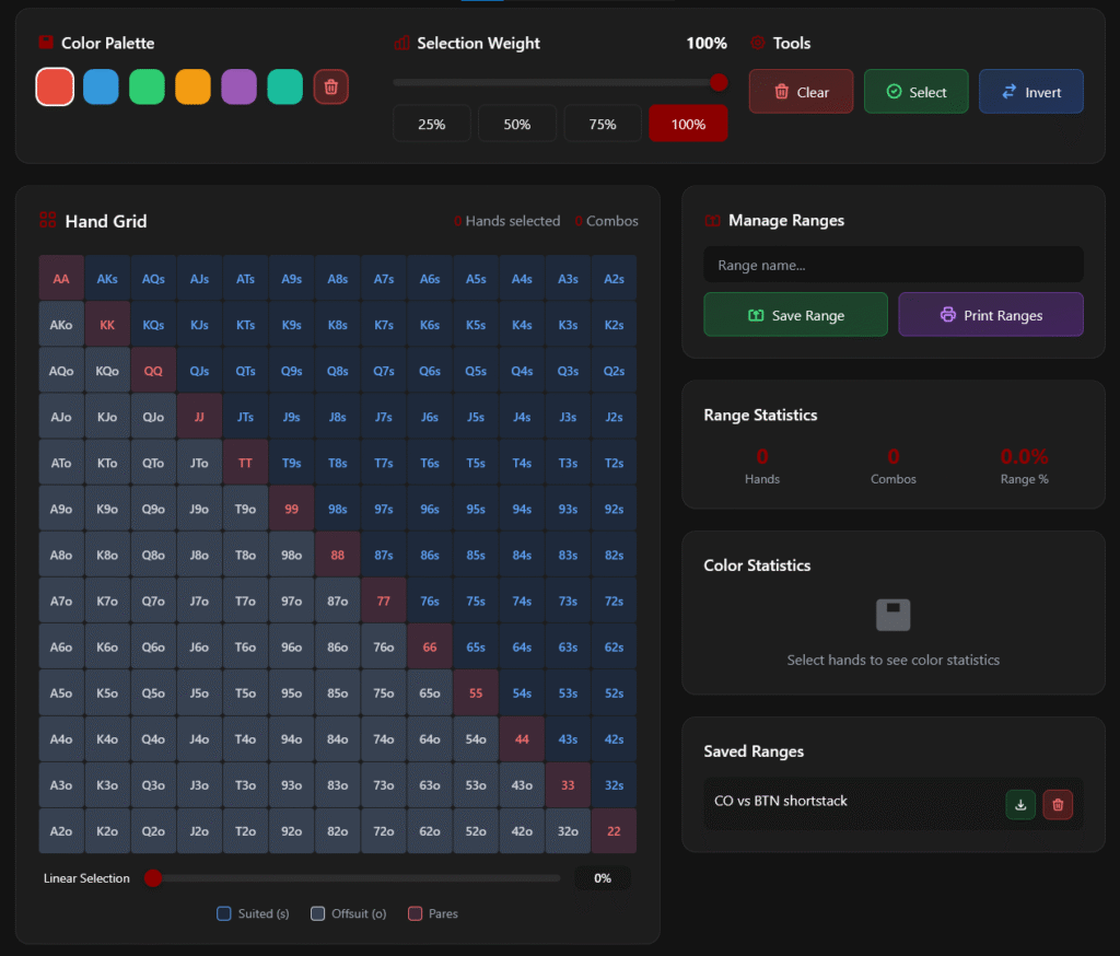 Color Palette and Selection Weight allow you to create custom ranges to represent different scenarios in your poker tourneys.