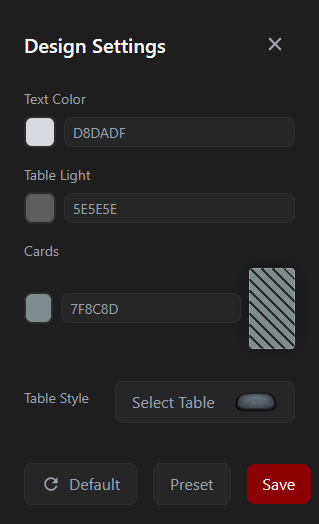 Customize your text color, table lights, go through different presets for cards, even table designs.