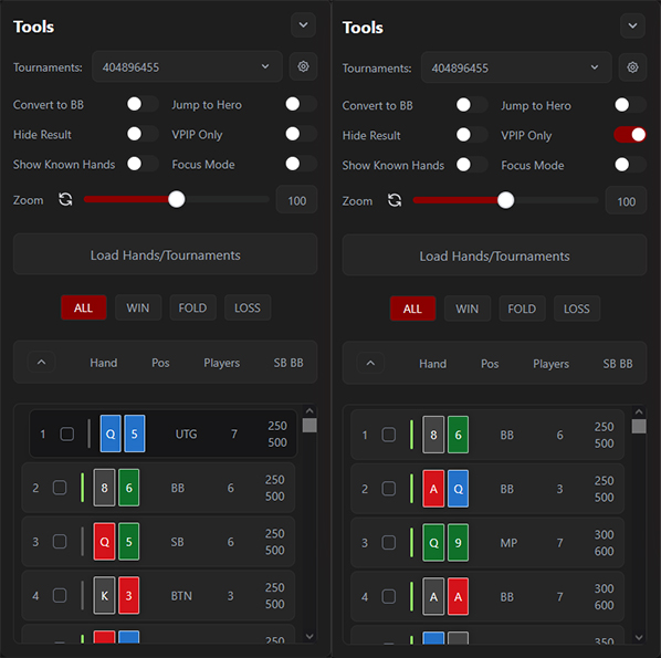 VPIP means “Voluntary Put In Pot”, it is a statistic given to how times a given poker player puts money on a hand. Checking the VPIP Only will filter all hands you effectively put chips on. We don’t wanna see ourselves scrolling through folded seven-deuces for most sessions.