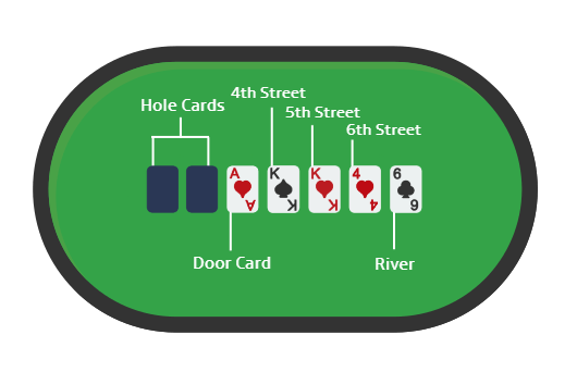 Two cards (known as hole cards) are dealt face down to each player, and then five community cards are dealt in three stages called streets. These are known as “flop”, “turn”, and “river”.